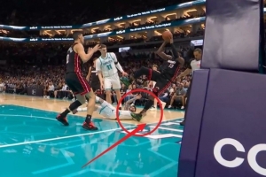 GIF-这动作不好!三球用手扒阿德巴约脚后跟致其倒地受伤,已回更衣室!