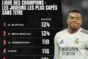 98场0欧冠!未夺欧冠出场次数榜:姆巴佩第9,布冯伊布124场第一